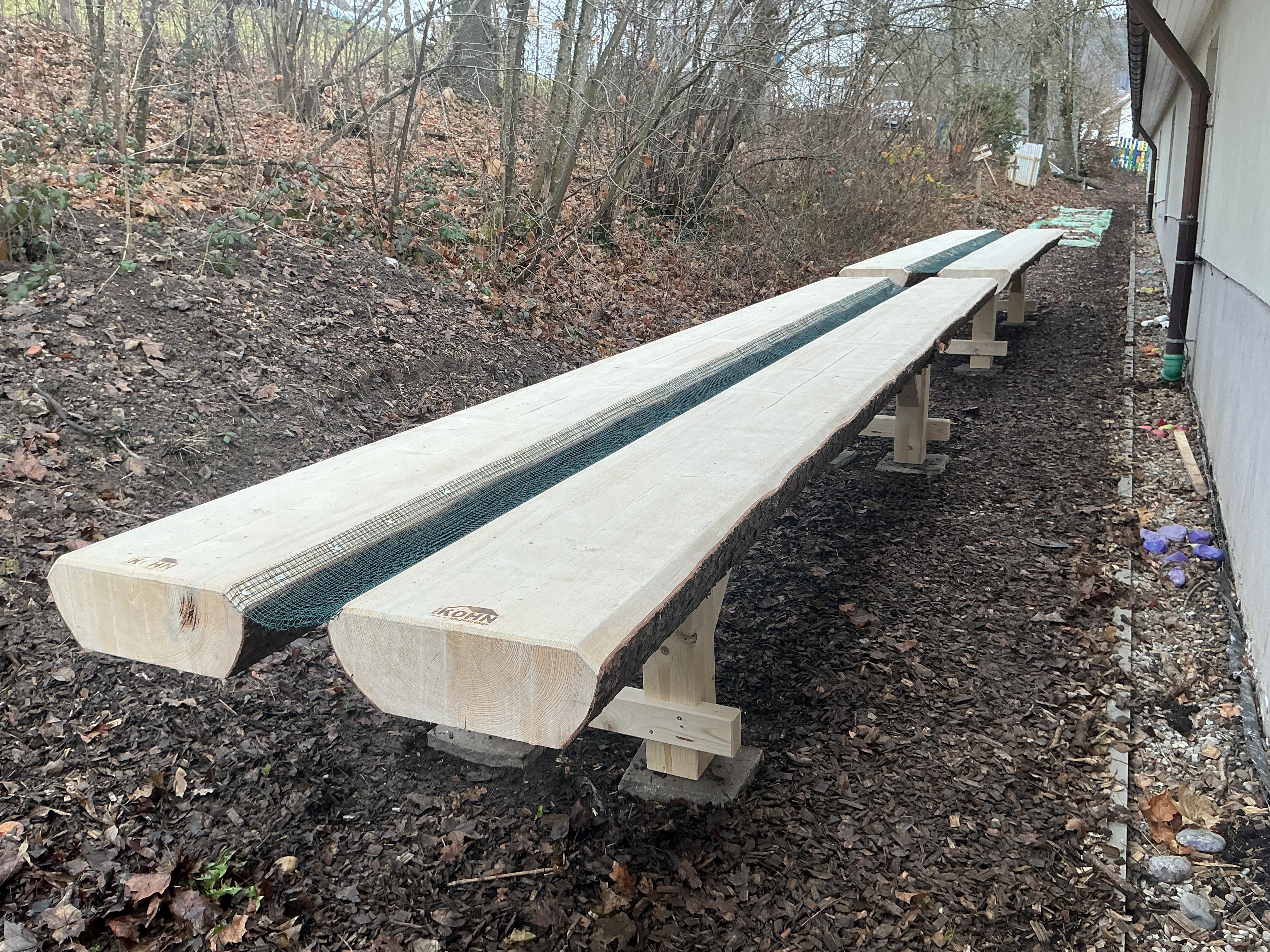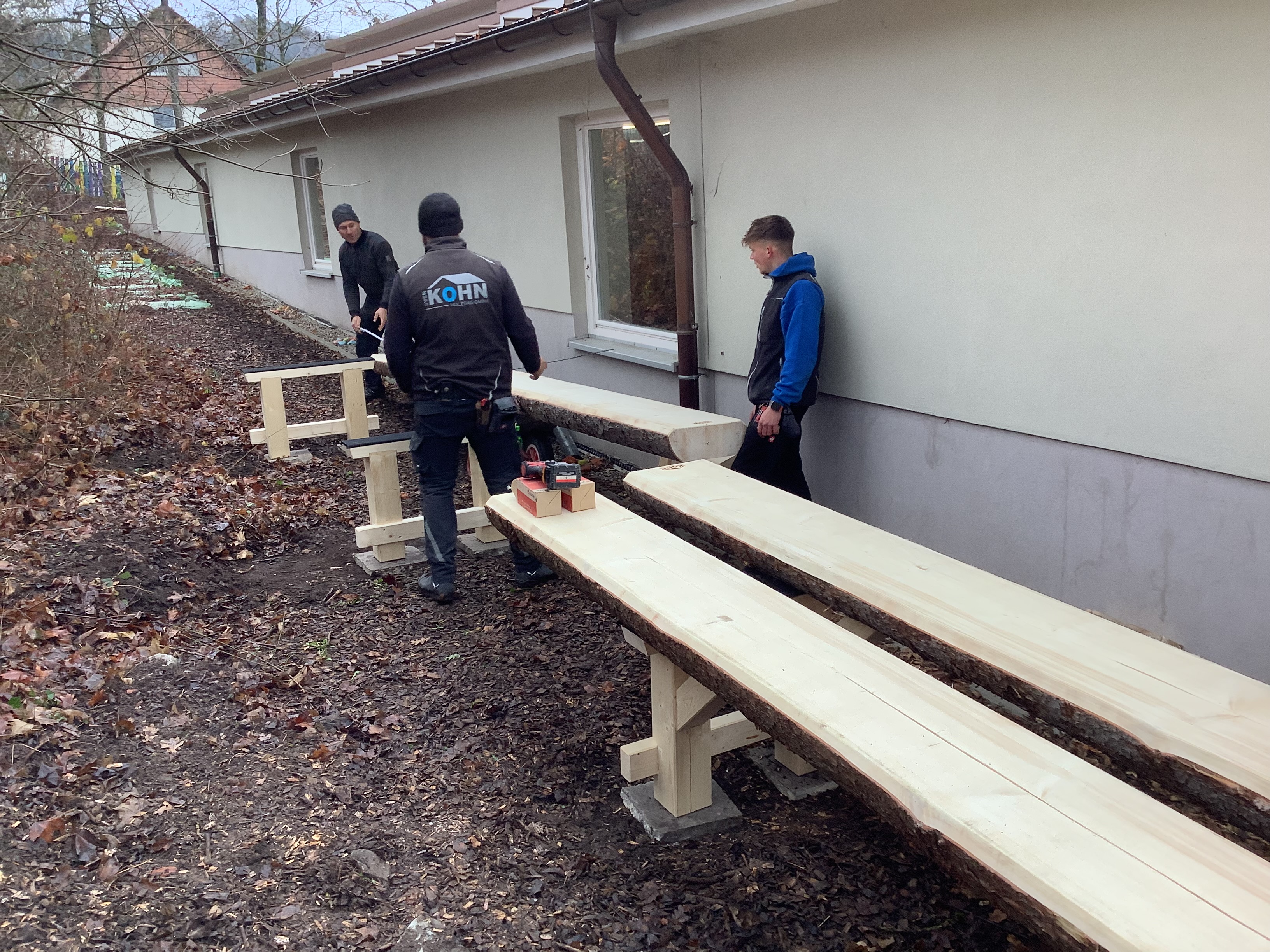 Nach einem gemeinsamen Treffen und der Besichtigung des vorgesehenen Standorts im Grünen Klassenzimmer durch Annegret Göhringer, Sven Kohn und Petra Maier stand der Umsetzung nichts mehr im Wege. Am letzten Schultag vor den Weihnachtsferien errichteten Mitarbeiter der Firma Holzbau Kohn die Naturforschertische vor Ort.