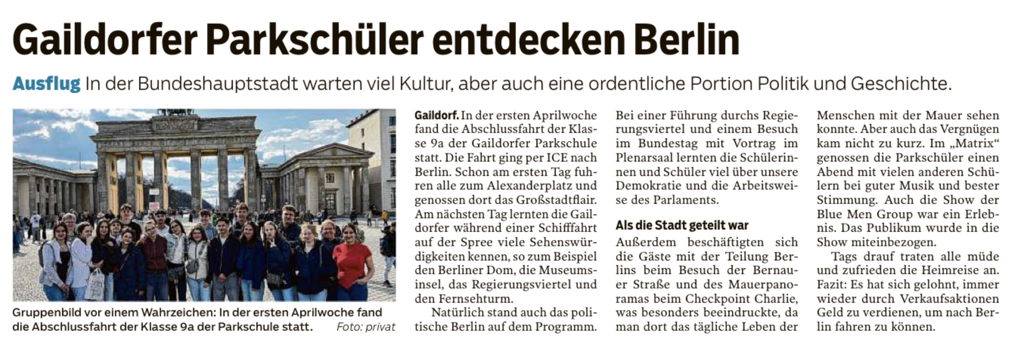 In der ersten Aprilwoche fand die Abschlussfahrt der Klasse 9a der Parkschule statt. Die Fahrt ging per ICE nach Berlin. Schon am ersten Tag fuhren wir zum Alexanderplatz und genossen dort das Großstadtflair. Am nächsten Tag lernten wir während einer Schifffahrt auf der Spree viele Sehenswürdigkeiten kennen, so z.B. dem Berliner Dom, die Museumsinsel, das Regierungsviertel und den Fernsehturm.
