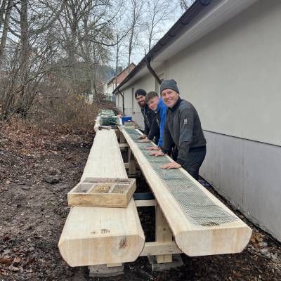 Nach einem gemeinsamen Treffen und der Besichtigung des vorgesehenen Standorts im Grünen Klassenzimmer durch Annegret Göhringer, Sven Kohn und Petra Maier stand der Umsetzung nichts mehr im Wege. Am letzten Schultag vor den Weihnachtsferien errichteten Mitarbeiter der Firma Holzbau Kohn die Naturforschertische vor Ort.
