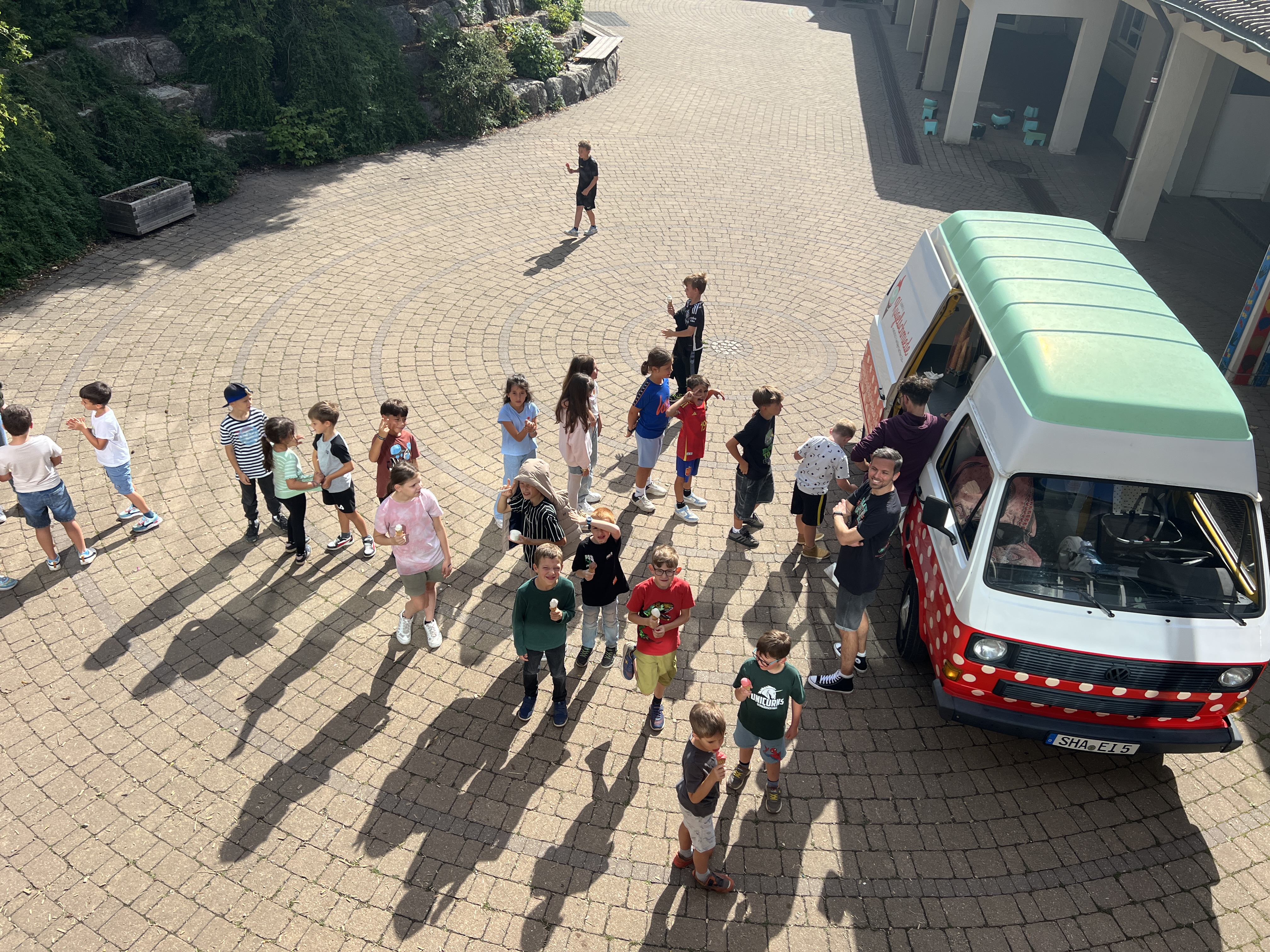 Am Mittwoch, den 23. Juli 2025, kam der Eiswagen von Judiths Kugelschmiede aus Fichtenberg auf den Pausenhof der Parkschule.