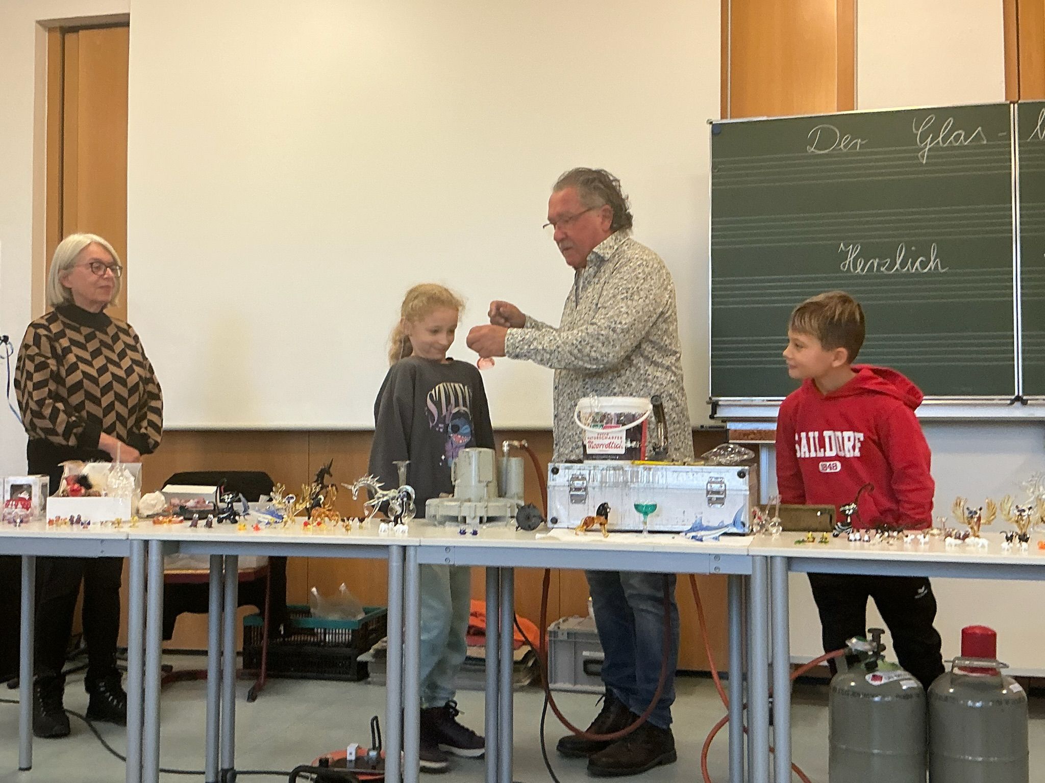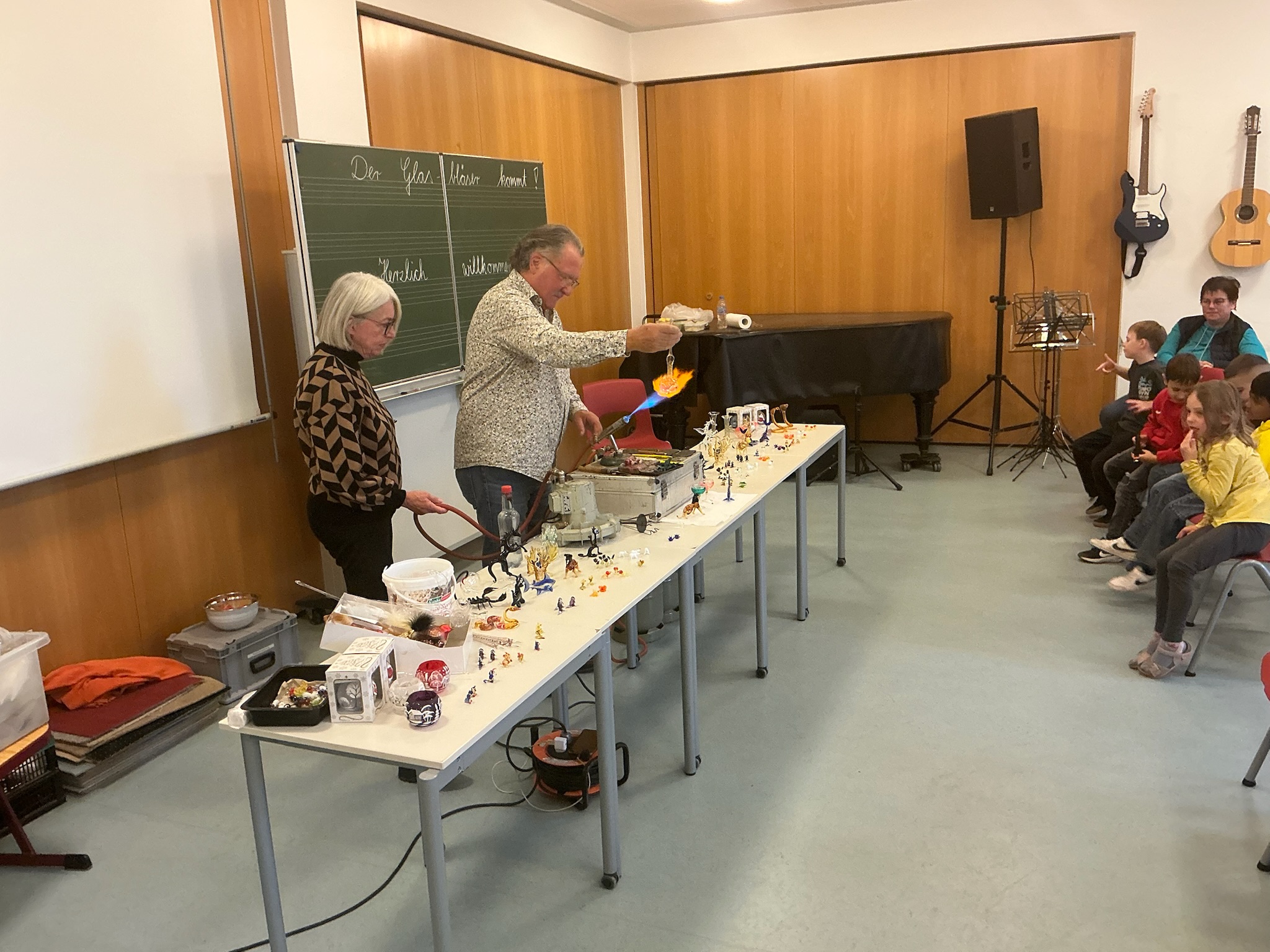 Dafür bauten unsere Gäste, das Ehepaar Sommer, viele Handwerksmaterialien im Musiksaal auf. Die beiden Glasbläser führten ihre beeindruckenden Handwerkskünste vor und zogen damit die gebannte Aufmerksamkeit der Kinder auf sich. Geduldig erklärte sie nebenbei allerlei Wissenswertes über die Glasbläserei. Scheinbar mühelos fertigten die Glasbläser mit eleganten Handgriffen über der heißen Flamme Kugeln, Vasen und kleinere Kunstwerke aus Glas.