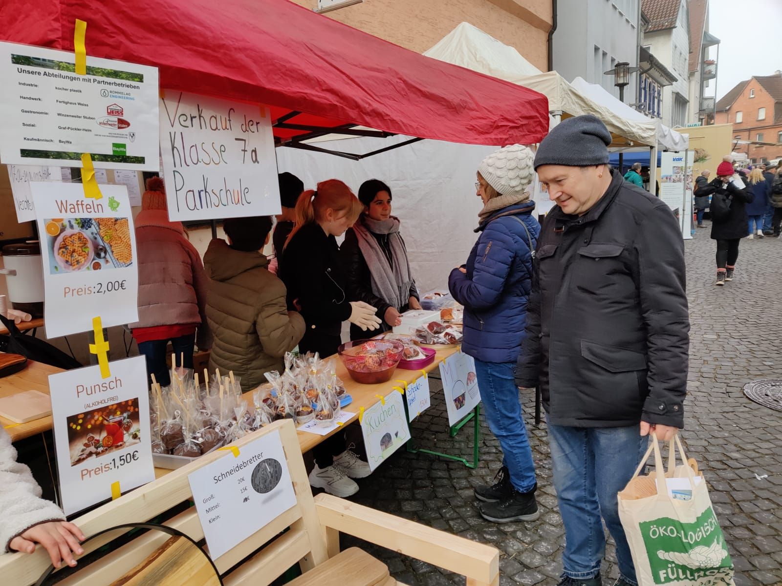 Die Klasse 7a und die Schülerfirma der Parkschule verkaufen mit ihrer Lehrerin Annegret Göhringer ihre Produkte auf dem Pferdemarkt.