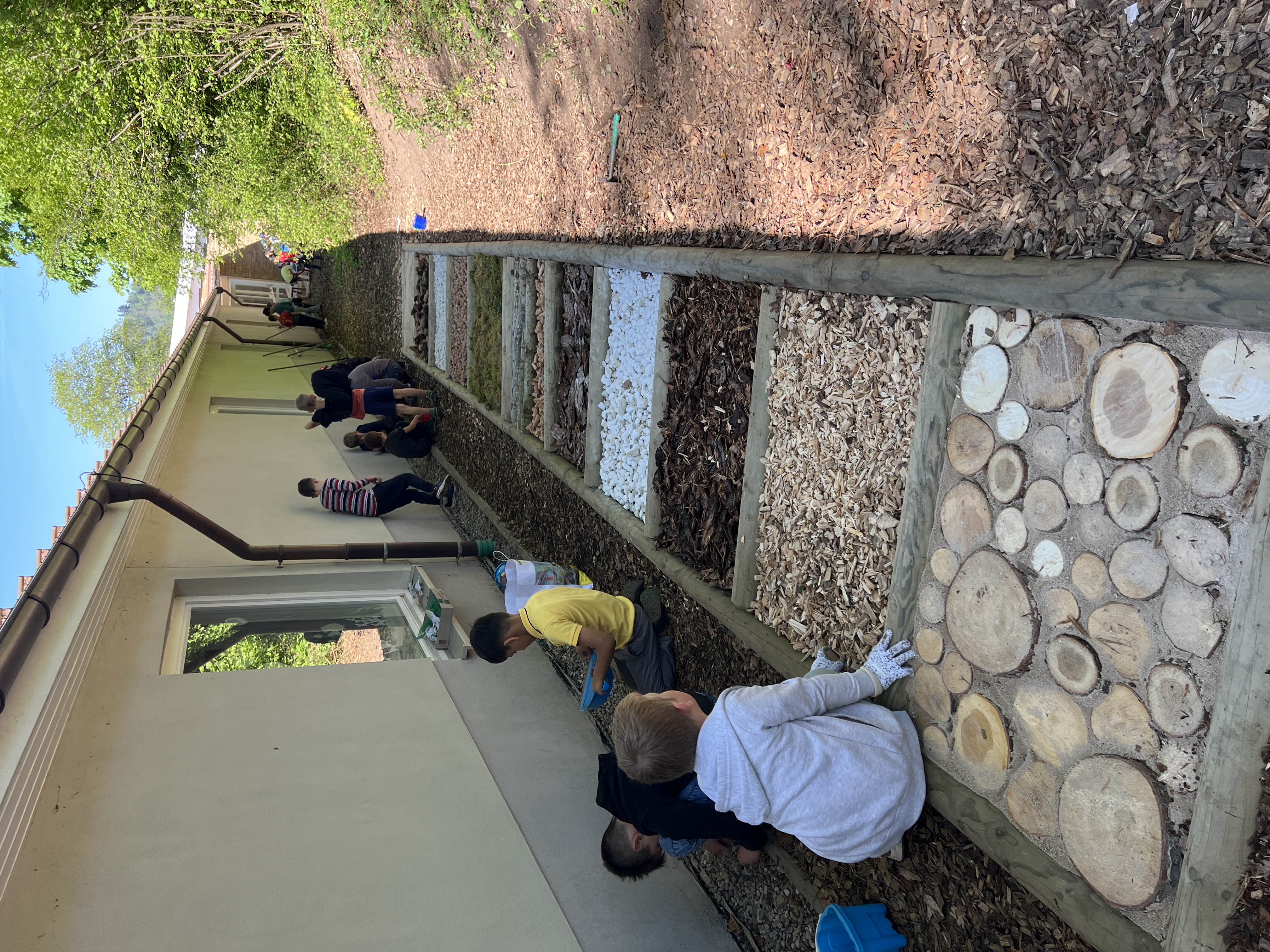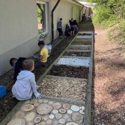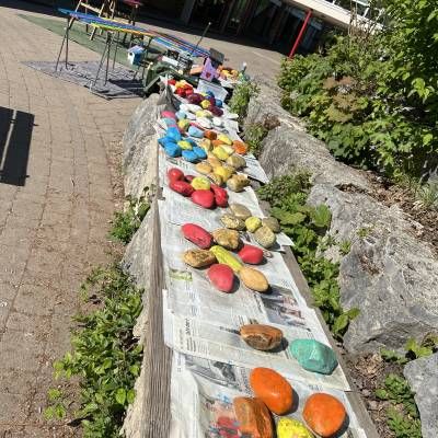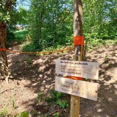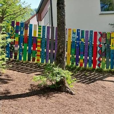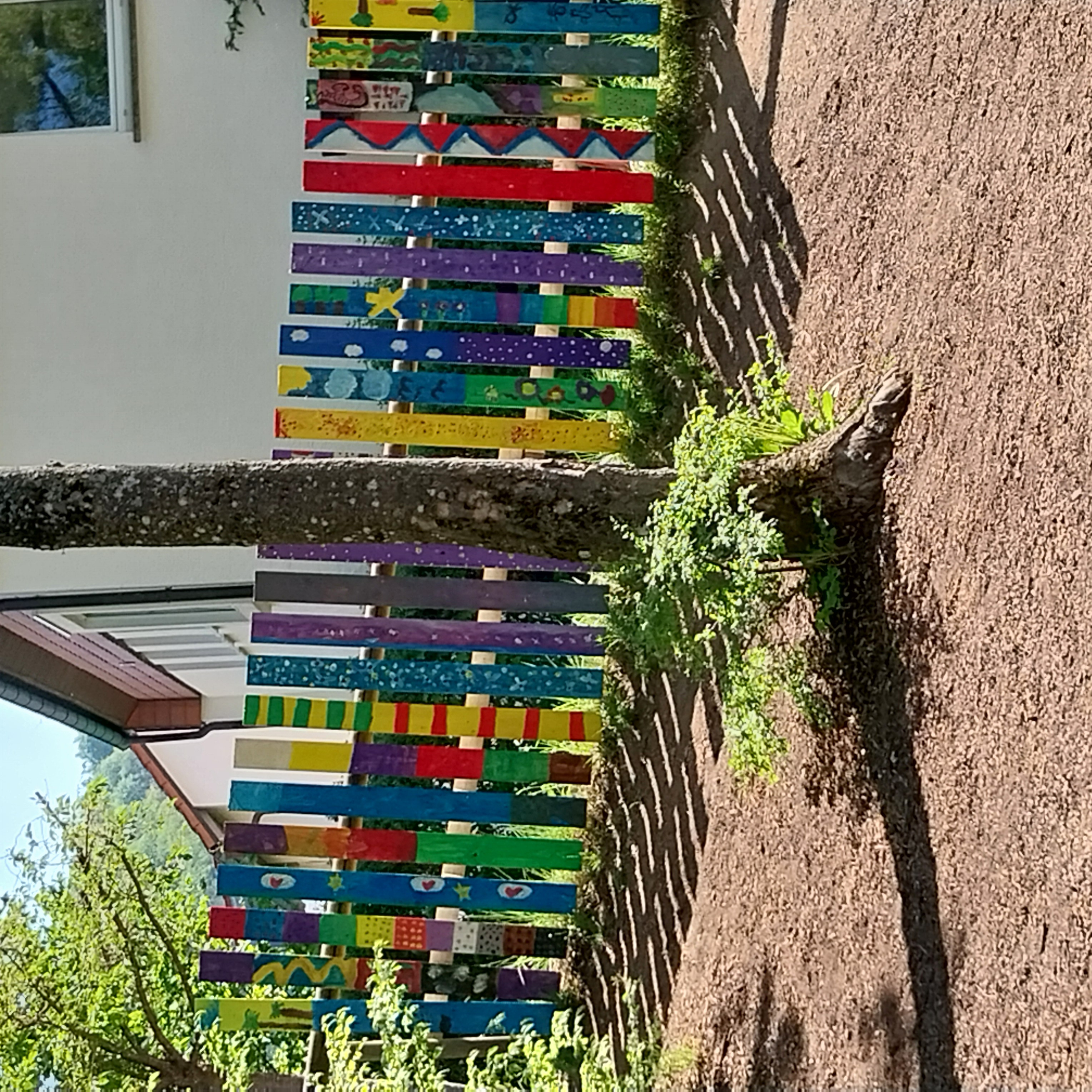 Die Klassen 2 gestalteten den Barfußpfad mit der finanziellen Unterstützung der Bürgerstiftung. Die Kinder wurden auch künstlerisch aktiv und bemalten Zaunlatten, die dann bei dem Schulspielplatz der Grundschule angebracht wurden.