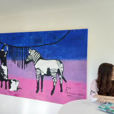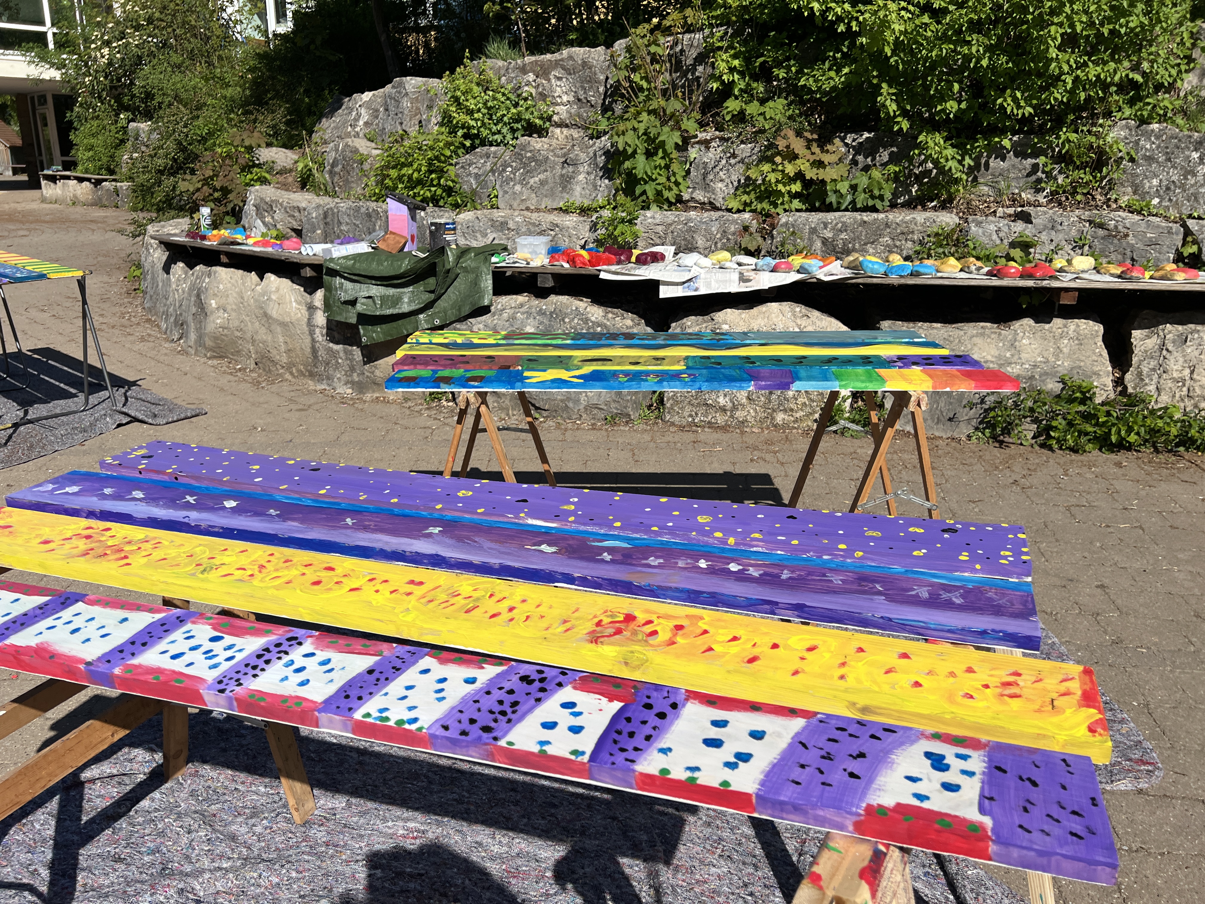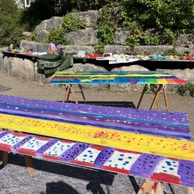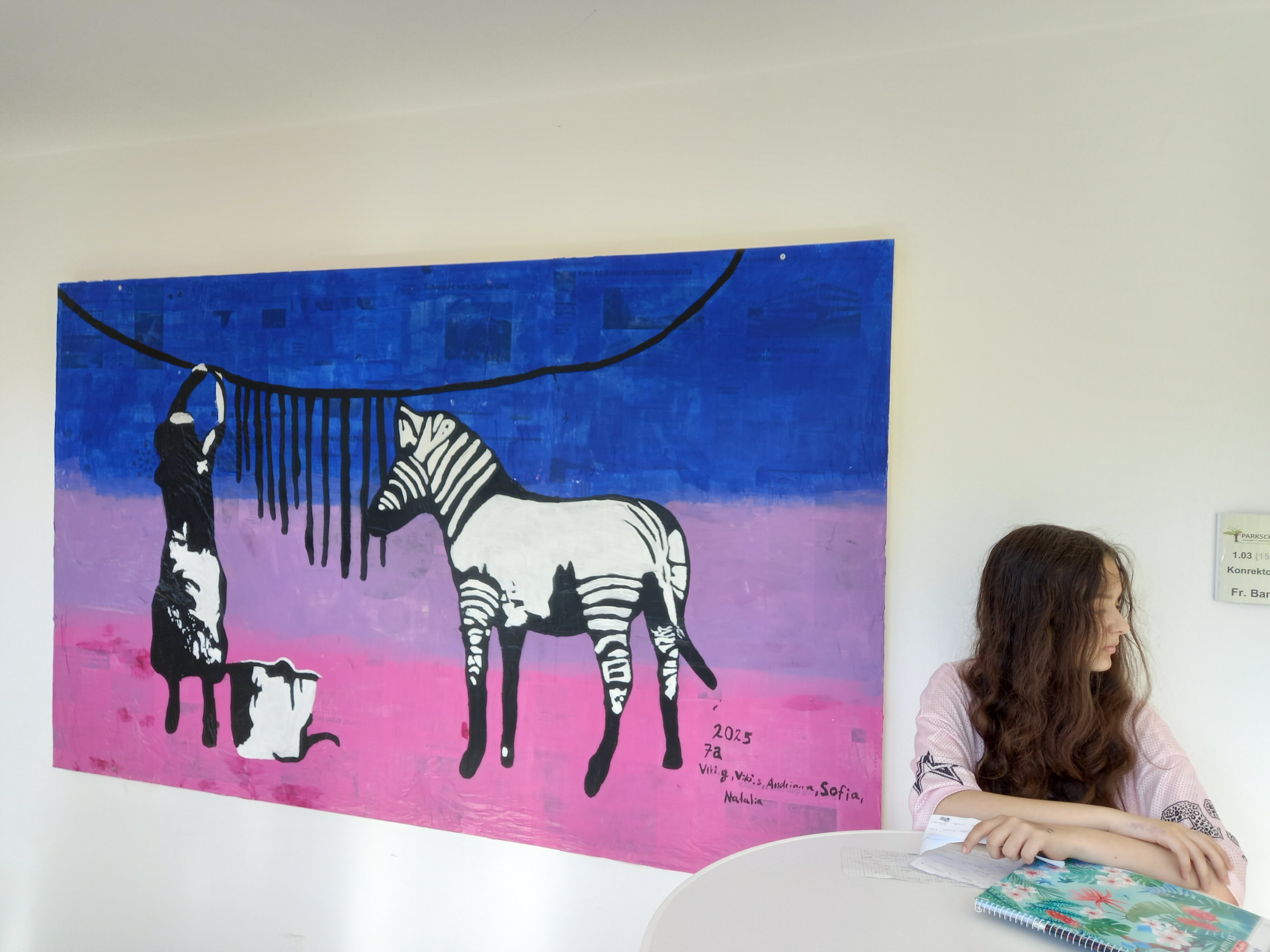 Die Klasse 7a war auf "Banksys Spuren“. Auf großflächigen Holztafeln wurden nach der Grundierung 4 Werke von dem Graffiti Künstler Banksy ausgewählt, übertragen und anschließend mit Acrylfarbe gemalt. Mit kleinen künstlerischen Freiheiten der SchülerInnen. Die 4 übergroßen Werke wurden im Schulhaus aufgehängt und erinnern die SchülerInnen täglich an ihre Kunst, die sie gestaltet haben.