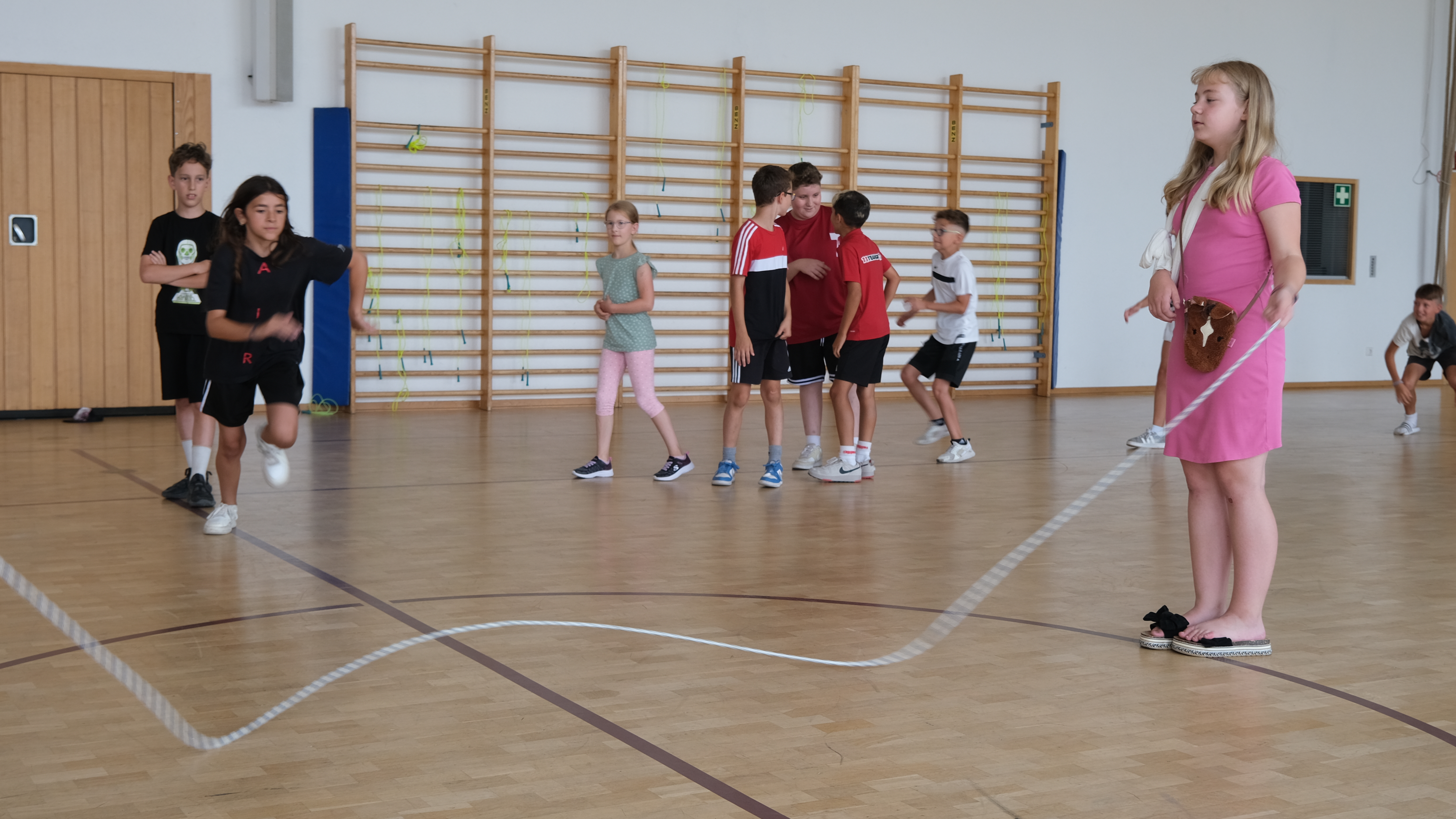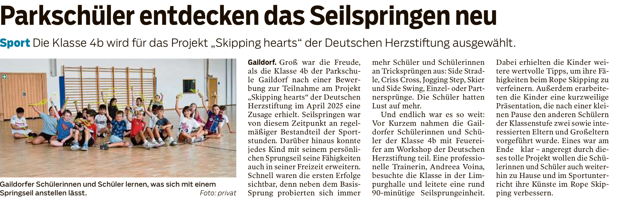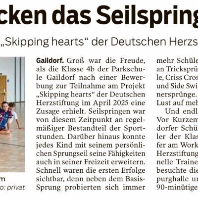 Groß war die Freude, als die Klasse 4b der Parkschule Gaildorf nach einer Bewerbung zur Teilnahme am Projekt „Skipping hearts“ der deutschen Herzstiftung im April 2025 eine Zusage erhielt. Seilspringen war von diesem Zeitpunkt an regelmäßiger Bestandteil der Sportstunden. Darüber hinaus konnte jedes Kind mit seinem persönlichen Sprungseil seine Fähigkeiten auch in seiner Freizeit erweitern. Schnell waren die ersten Erfolge sichtbar, denn neben dem Basis-Sprung probierten sich immer mehr Schüler und Schülerinnen an Tricksprüngen aus: Side Stradle, Criss Cross, Jogging Step, Skier und Side Swing, – Einzel- oder Partnersprünge. Die Schüler hatten Lust auf mehr!