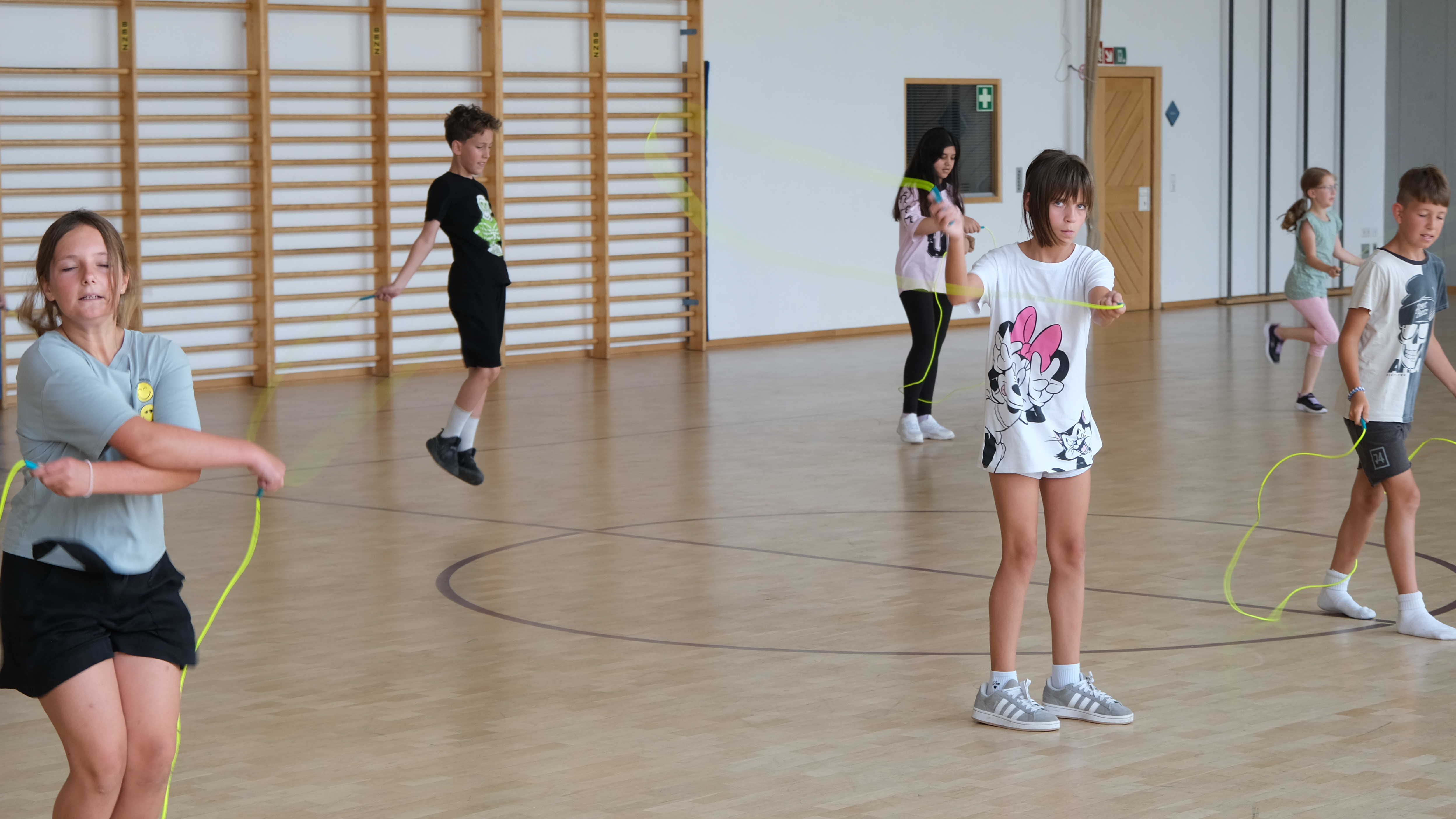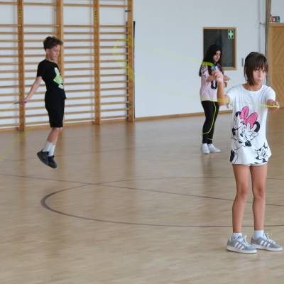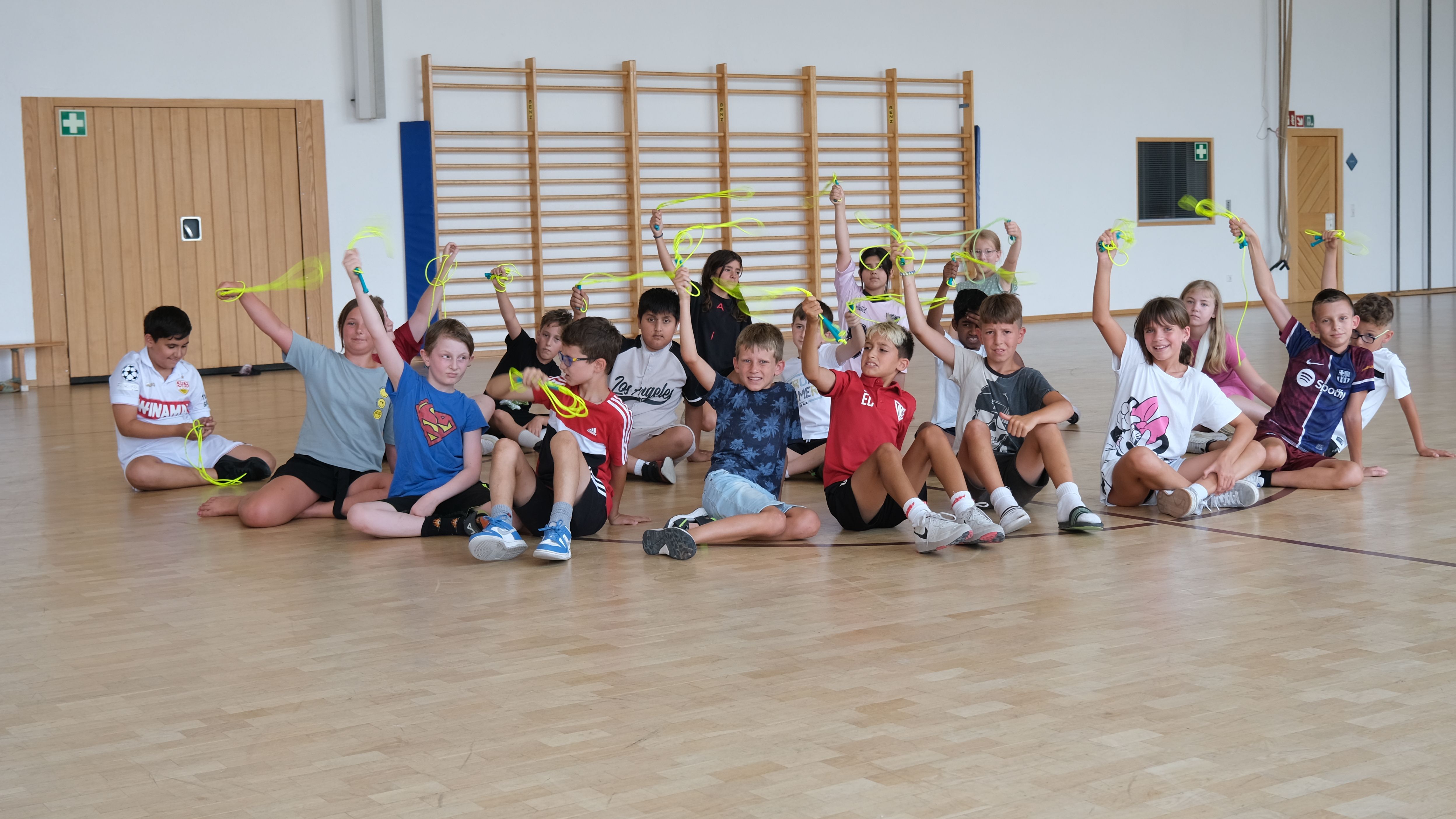 Und endlich war es soweit: am Freitag, dem 27.06.2025 nahmen die Schülerinnen und Schüler der Klasse 4b mit Feuereifer am workshop der Deutschen Herzstiftung teil. Eine professionelle Trainerin, Frau Andreea Voina, besuchte die Klasse in der Limpurghalle und leitete eine rund 90-minutige Seilsprungeinheit. Dabei erhielten die Kinder weitere wertvolle Tipps um ihre Fähigkeiten beim Rope Skipping zu verfeinern. Außerdem erarbeiteten die Kinder eine kurzweilige Präsentation, die nach einer kleinen Pause den anderen Schülern der Klassenstufe 2 sowie interessierten Eltern und Großeltern vorgeführt wurde. Eines war am Ende klar – angeregt durch dieses tolle Projekt wollen die Schülerinnen und Schüler auch weiterhin zu Hause und im Sportunterricht ihre Künste beim Rope Skipping verbessern!