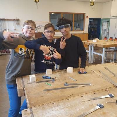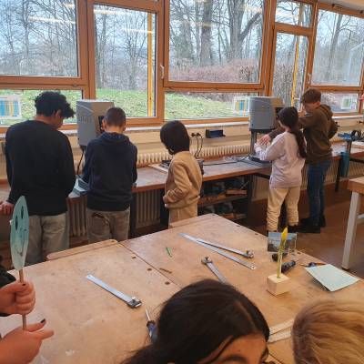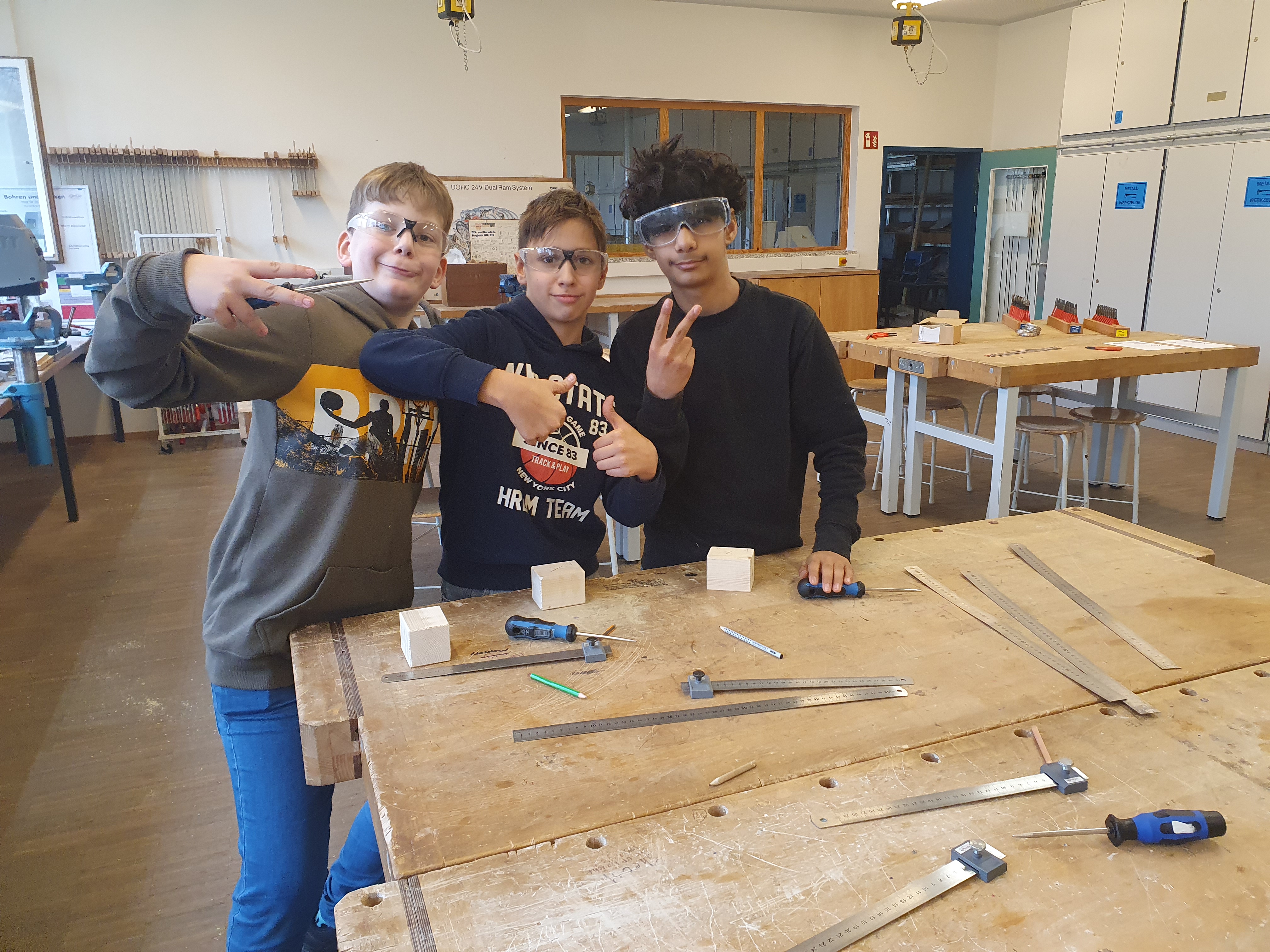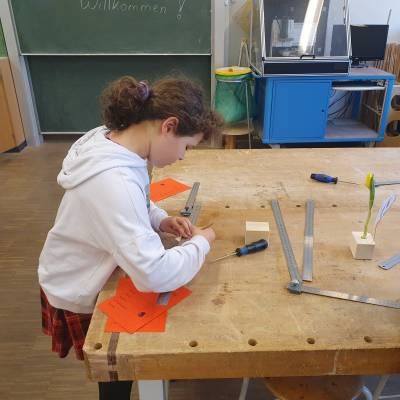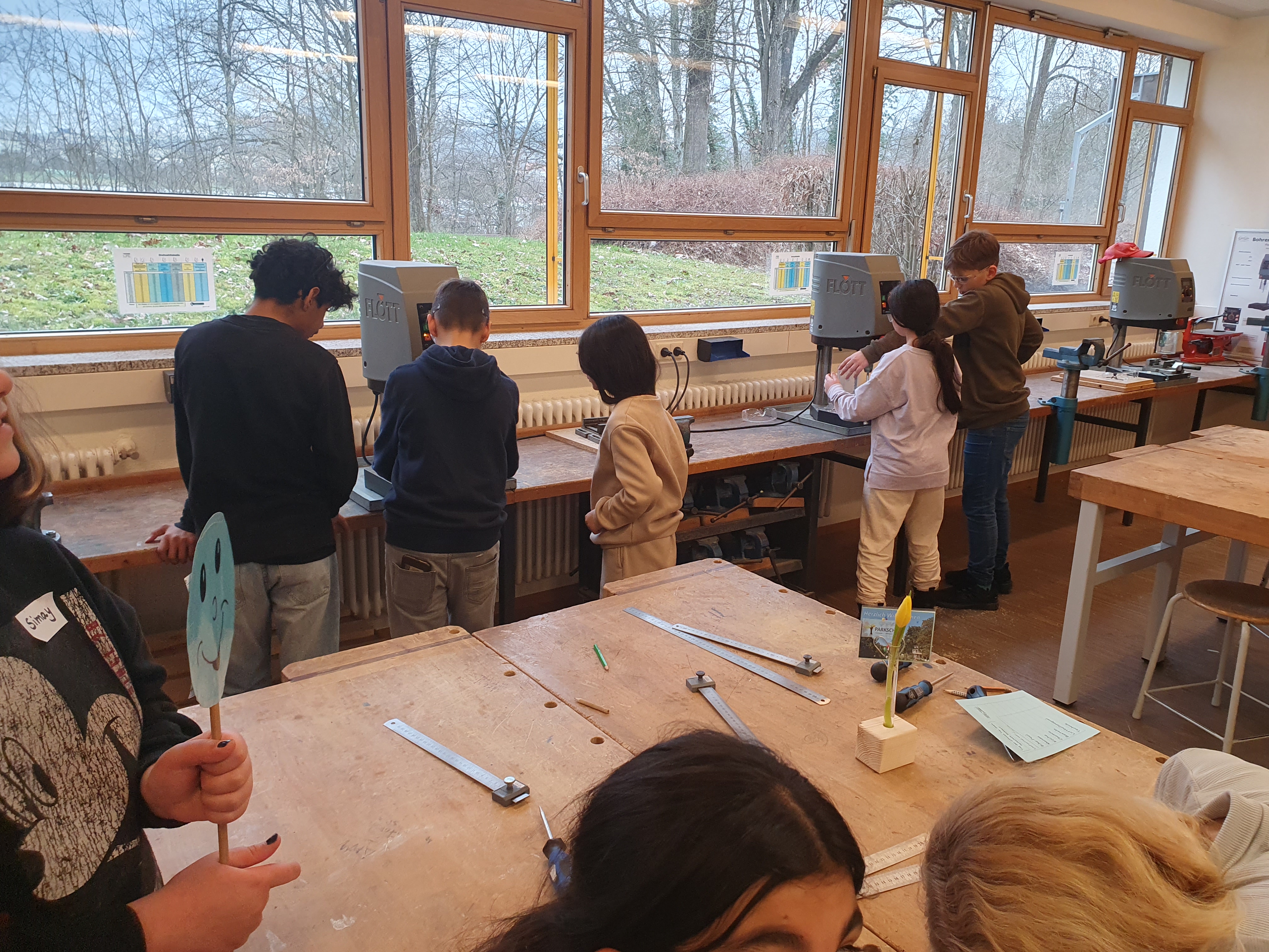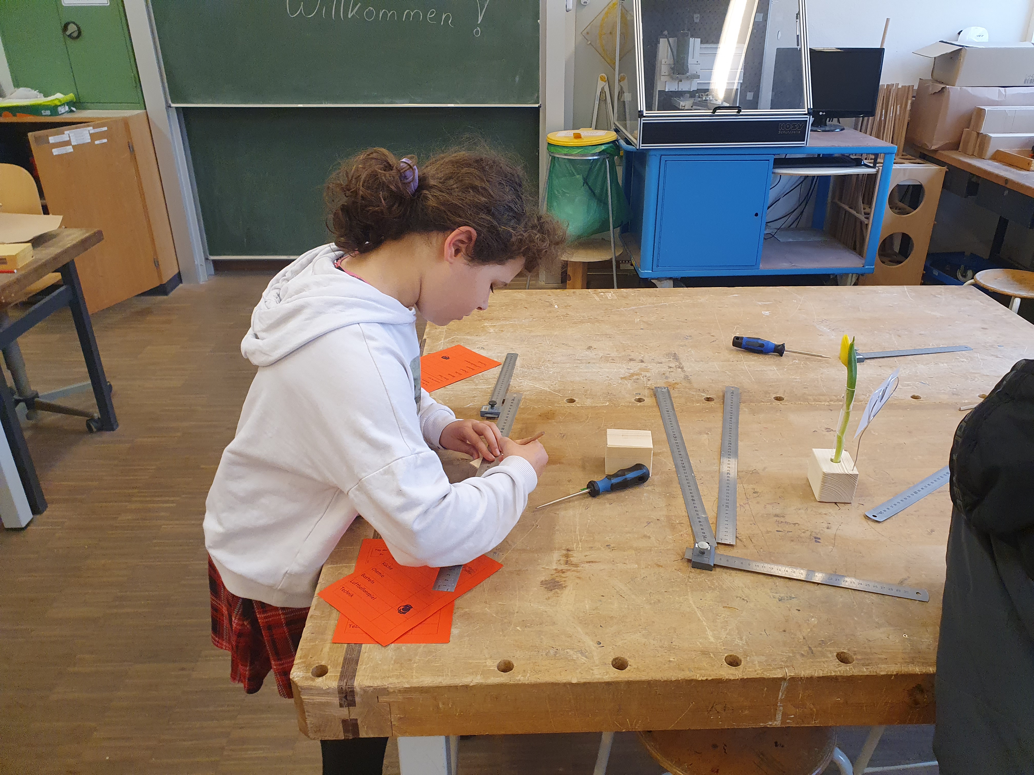 Eine weitere Station waren die Technikräume. Dort konnten die SchülerInnen unter Leitung von Jörg Reichert und mit Hilfe einiger Sechstklässler einen Vasenhalter aus Holz herstellen. So konnten erste Erfahrungen mit dem Bohrer gemacht werden.