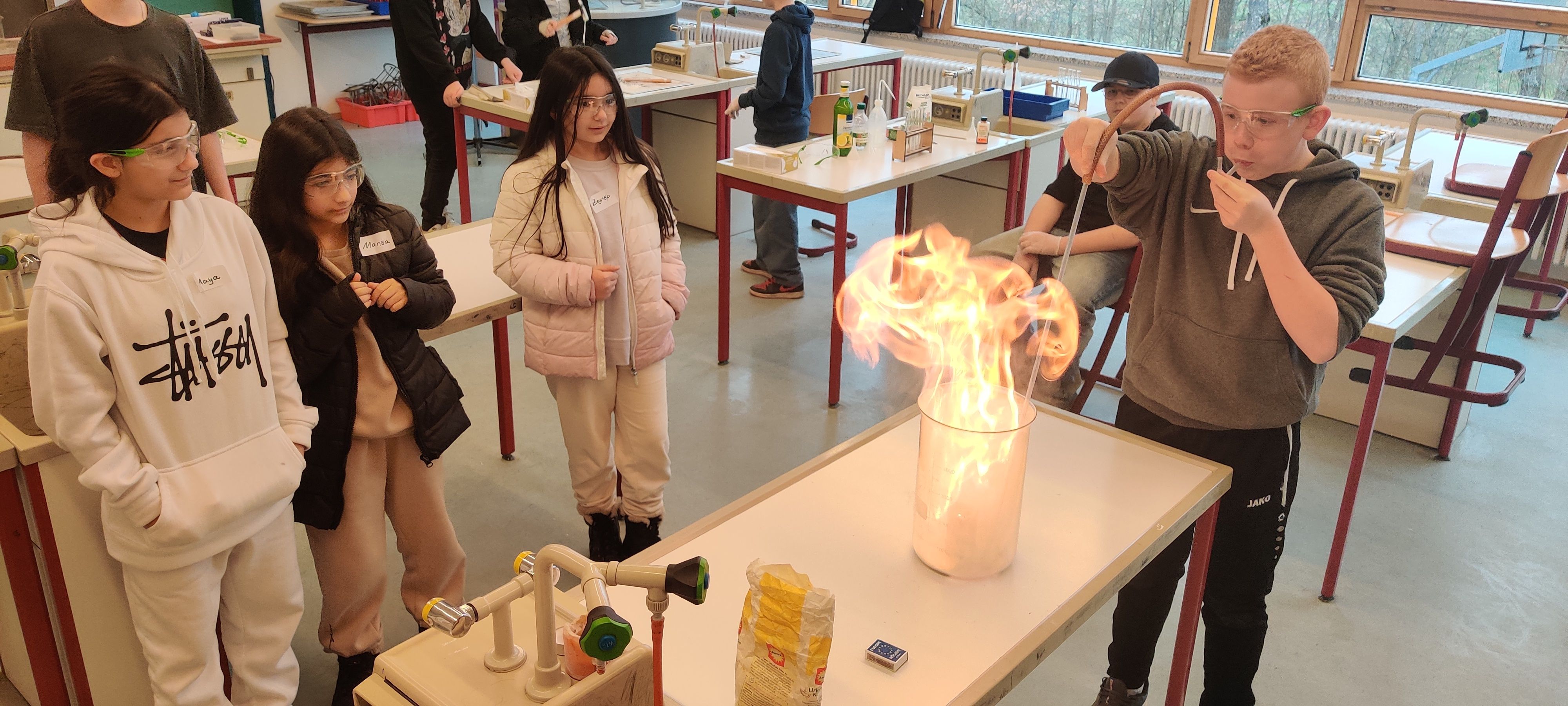 Im Chemiesaal erwartete die Kinder unter Leitung von Konstantin Ilenzeer verschiedene Experimente. Einige zum Selbermachen, einige zum Zuschauen. Es wurde u.a. die Bedienung eines Brenners gezeigt, die Simulation einer Mehlstaubexplosion sowie das Farbspiel bei Säuren und Laugen.