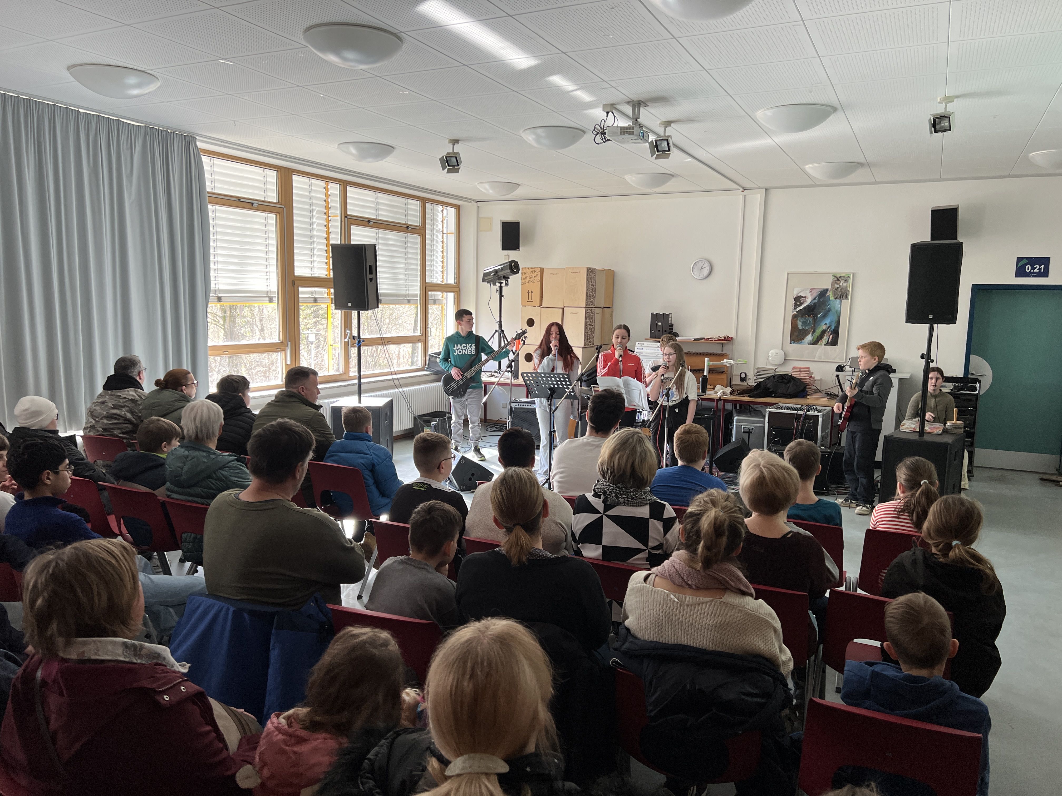 Die Schulband eröffnete mit 3 Songs (von Cro und Ayliva). Die Bandbesetzung,