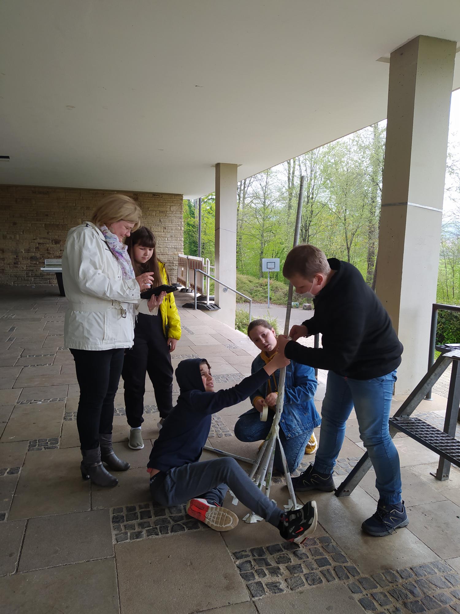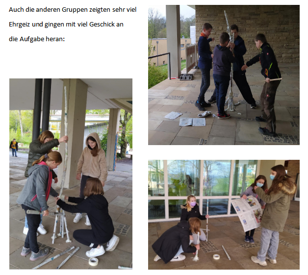 Diese Woche erhielt die Klasse 5b die Aufgabe in einer Kleingruppe einen „möglichst hohen und freistehenden Zeitungsturm“ zu basteln. Das einzige Material, das ihnen dabei zu Verfügung stand waren: Klebeband, eine Holzstange zum Formen und natürlich jede Menge Zeitungspapier.